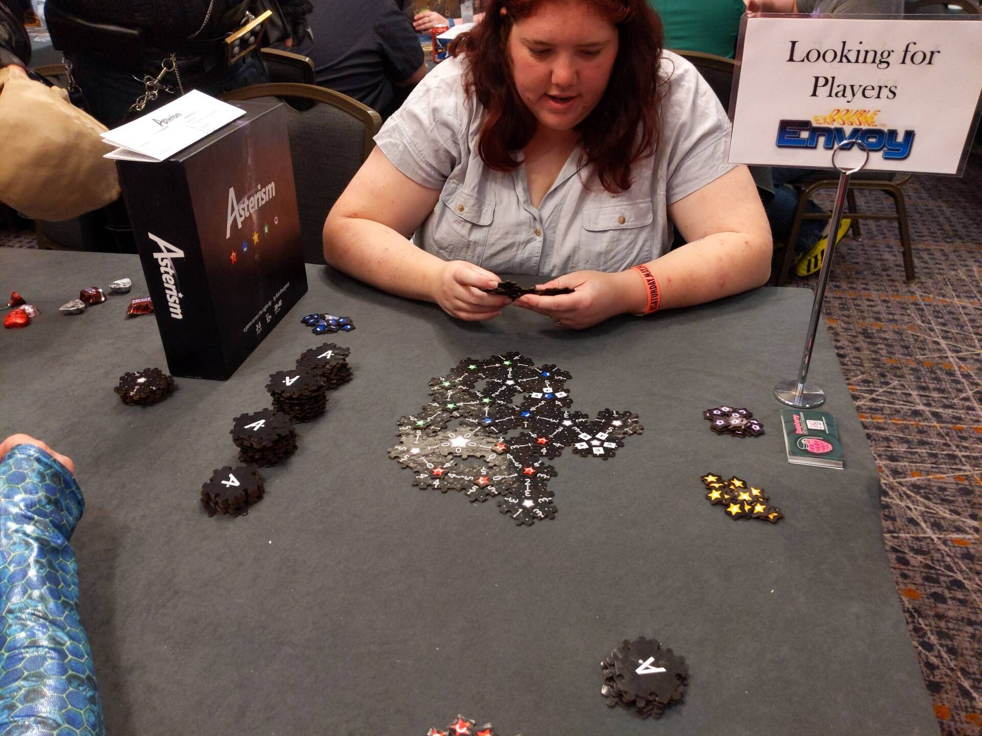 Me at a table at Starfest, all set up to play some Flanxiety!